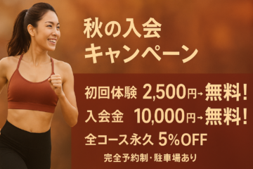 「運動を始めたいけど続けられるか不安…」そんな方も大丈夫。パーソナルトレーニングなら、あなた専属のトレーナーが一歩ずつ丁寧にサポートします。今月は入会キャンペーン実施中!「まずはやってみよう」という気持ちを応援する特別なチャンスです。秋に向けて、新しい自分をスタートしてみませんか?