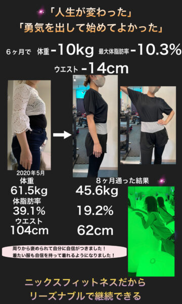 「自分を変えたい」——その気持ちに寄り添う場所 最初の一歩は、少しの勇気から。 この方も、運動が苦手で続けられるか不安な状態からのスタートでした。 それでも8ヶ月で、−15.9kgの減量、体脂肪率は約半分に。 ウエストも−42cmと、大きな変化を実現しました。 「着たい服が着られるようになって嬉しい」 「人に褒められることが増えて、自分に自信が持てた」 そんな言葉が、私たちにとって何よりの励みです。 ニックスフィットネスでは、ただ体を鍛えるだけでなく、 “自分を好きになれる”ようなサポートを大切にするパーソナルジムです。 無理なく、だけどしっかり変わる——。そんな場所でありたいと思っています。